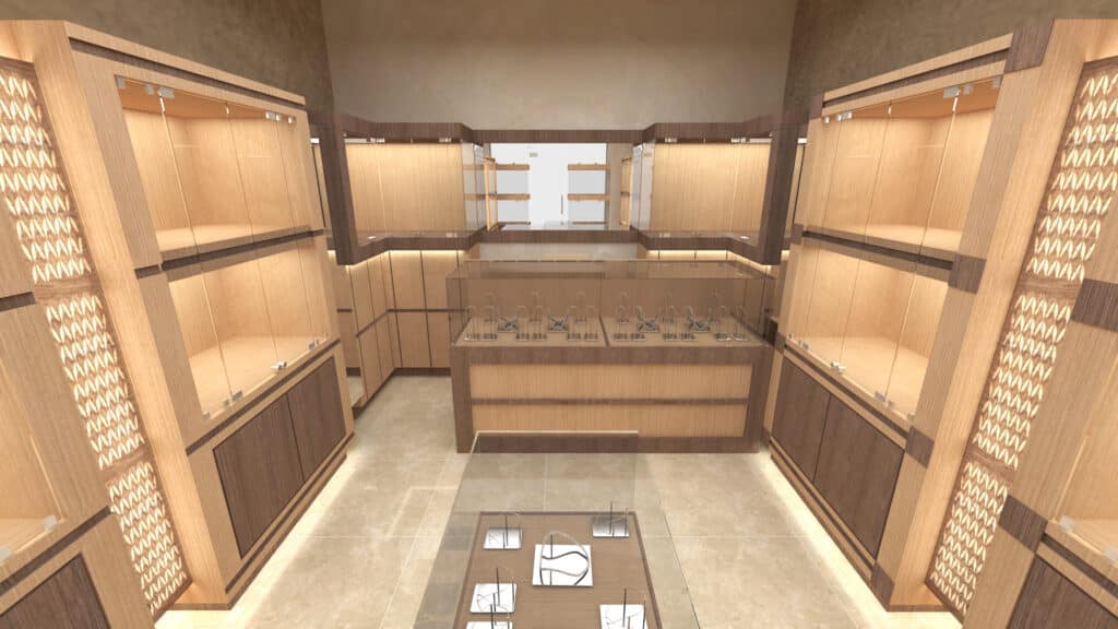 Nous avons démarré par la conception design et l’élaboration des plans techniques, afin de structurer un espace harmonieux, optimisé pour l’exposition et l’expérience client.
